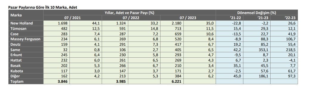 2023 yılı Temmuz ayında da önemli satış adetlerine ulaşan New Holland 2.180 adet traktör satışı gerçekleştirdi. Listenin devamında ise Massey Ferguson 713, Deutz 659, Tümosan 520, Case 417, Erkunt Traktör 405, Same 293, Hattat Traktör 269, Başak Traktör 210, Kubota 171 ve diğer traktör 384 adet satış gerçekleştirdi. Temmuz ayında toplam traktör tescil sayısı, 6.221 oldu.