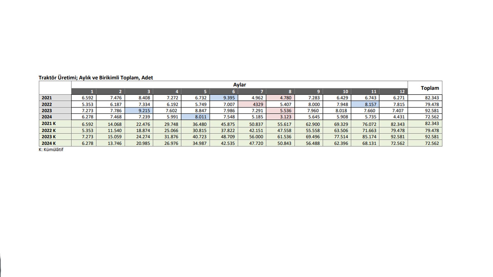 Traktör üretiminde Aralık 2024’te 4.431 adet traktör üretilmiş olup bir önceki yıla göre yüzde 40.2 oranında gerileme görülüyor. Son 3 yılın aralık ayı verileri dikkate alındığında, 2024 yılındaki değişim %38,1 oranında azaldı. 2024 yılının Ocak–Aralık döneminde 72.562 adet traktör üretildiği belirtilirken bu sayıda, geçen yılın aynı dönemine göre yüzde 21,6’lık bir azalma meydana geldi. Son 3 yılın Ocak–Mayıs dönemi verileri dikkate alındığında 2024 yılında yüzde 14,4 oranında azalma görüldü.