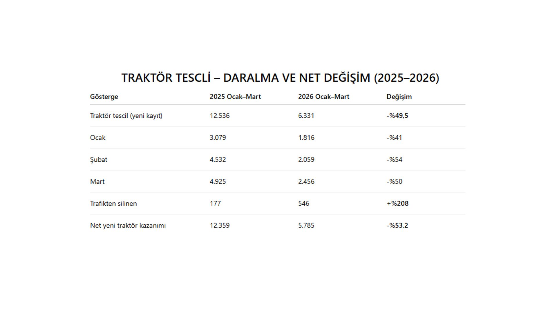 TÜİK’in 2026 Mart verileri ve 2025–2026 Ocak–Mart dönemi istatistiklerine göre Türkiye’de traktör tescilleri 12.536 adetten 6.331 adede gerileyerek %49,5 düşüş gösterdi. Aynı dönemde trafikten çekilen traktör sayısı 177’den 546 adede yükselirken, toplam traktör parkı 2.315.504’ten 2.321.253 adede çıktı. Veriler, pazarda sert daralma yaşandığını ve yeni tescillerdeki düşüşle birlikte toplam traktör parkı artış hızının belirgin şekilde yavaşladığını ortaya koyuyor.