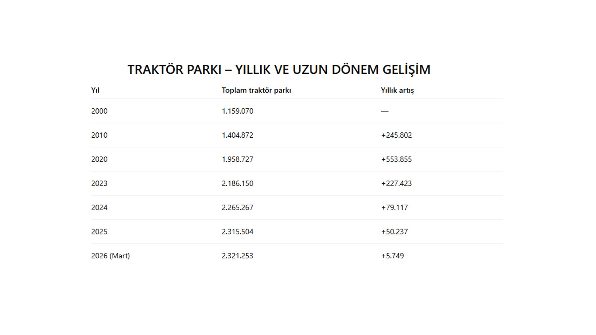 Türkiye genelinde toplam traktör sayısı 2026 yılı Mart ayı itibarıyla 2.321.253 adede ulaştı. Bir önceki yıl bu sayı 2.315.504, 2024 yılında ise 2.265.267 olarak kaydedilmişti. Daha geriye gidildiğinde 2023 yılında 2.186.150 adetlik park büyüklüğü görülüyor. Veriler, traktör parkının artmaya devam ettiğini ancak yıllık artış miktarının giderek azaldığını ortaya koyuyor. Nitekim son yıllarda on binler seviyesinde gerçekleşen artışın, 2026 yılına gelindiğinde oldukça sınırlı bir seviyeye gerilemesi dikkat çekiyor.