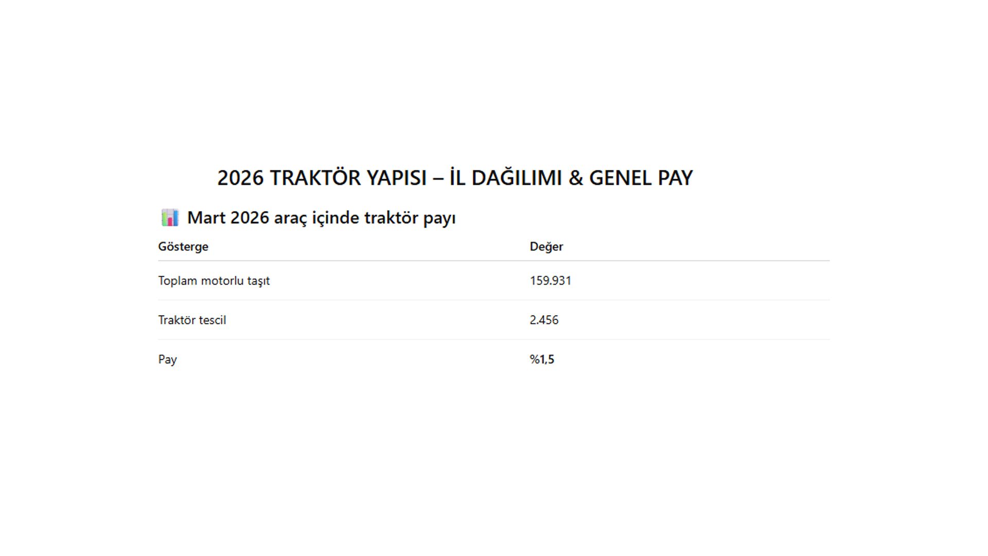 Mart 2026 verilerine göre trafiğe kaydı yapılan toplam taşıt sayısı 159.931 adet olurken, traktörler bu toplam içinde 2.456 adetle yer aldı. Bu da traktörlerin toplam tesciller içindeki payının yaklaşık %1,5 seviyesinde kaldığını gösteriyor. Bu oran, traktör pazarının genel motorlu taşıt pazarı içindeki sınırlı büyüklüğünü koruduğunu ortaya koyarken, mevcut daralma ile birlikte payın daha da baskı altında kalabileceğine işaret ediyor.