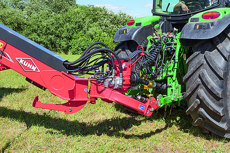 MergeMaxx 950’nin temel aletleri, yemin toplanması için toplayıcı ve yemi namlu içine taşıyan kayıştan oluşuyor. MM 950 ayrıca PTO pompası aracılığıyla tahrik edilen hidrolik tahrik sistemine sahip. Minimum toplama genişliği 7,50 m’dir. Büyümeye bağlı olarak değişen namlu genişliğini eklerseniz, 7,80 ile 9,70 m arasında çalışma genişlikleri elde edersiniz. Kuhn ayrıca MergeMaxx 760 ile daha dar bir model ve MergeMaxx 1090 ile daha geniş bir model sunuyor. Pikap ve dişlerin hızı tırtıklı vidalarla ayarlanabiliyor, ayrıca sürücü PTO hızını ayarlayabiliyor. Her iki aşağı bastırma silindirinin ve besleme plakasının ayrı ayarı, farklı yem türlerine ve hasat boyutlarına adaptasyona izin veriyor. Burgulu yay sistemi, temas basıncını düşürüyor. Anahtarla ayarlanıyor. Çalışma yüksekliği bir krank ile ayarlanıyor, aynı taraftaki ayarlamaya bir ölçek yardımcı oluyor. Gelecekte, hidrolik çalıştırma bir seçenek olarak sunulacak. Her iki taraftaki iki kızak, yükseklik ayarından sorumlu. Çelik kızaklar standart olarak sağlanıyor, istek üzerine çok ısınmayan plastikten yapılmış aşınma plakaları da temin edinilebiliyor. MM 950 bir kontrol terminali aracılığıyla çalıştırılıyor, ancak tırmık ISO-Bus uyumlu değil.