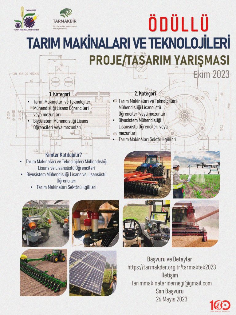 TARMAKBİR (Türk Tarım Alet ve Makineleri İmalatçıları Birliği) ve TARMAKDER (Tarım Makinaları Derneği) işbirliği ile yürütülecek olan ödüllü “Tarım Makinaları ve Teknolojileri Proje/Tasarım Yarışması” için başvuru süreci başladı. İki ana kategoride proje başvurusu alacak yarışma, toprak işlemeden, robotik sistemlere, hasat teknolojilerinden değişken oranlı ilaçlamaya, hayvan takip sistemlerinden akıllı sulamaya kadar tarım teknolojilerinin bütün alanlarına açık olacak. Yarışmaya son başvuru tarihi 26 Mayıs 2023 olarak belirlendi.