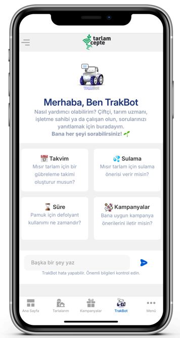 TürkTraktör, çiftçilerin hayatını kolaylaştırmak amacıyla devreye aldığı mobil uygulaması Tarlam Cepte’yi geliştirmeye devam ediyor. Tarlam Cepte’nin sektördeki ilk yapay zekâ destekli yeni sohbet robotu TrakBot, çiftçilerin her an yanında olan dijital bir asistan olarak çalışıyor. Çiftçilerin karar alma süreçlerine hız kazandıran TrakBot, kullanıcıların sorularına anında yanıt vererek tarımsal verimliliği artırmayı hedefliyor.